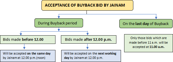 Time limit to accept the bid on the last day of buyback :- On the last day of the buyback, only those bids will be accepted by the Jainam which are made till 11:00 AM of that day.