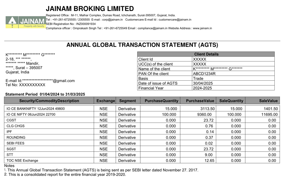 The Annual Global Transaction Statement (AGTS) is a detailed, SEBI-compliant document provided by Jainam Broking Ltd. that consolidates your trading activity for the entire financial year. This statement is issued after the financial year ends and is emailed to clients. How to understand the AGTS: Each AGTS includes a tabular breakdown of your transactions. Here’s what the columns mean: