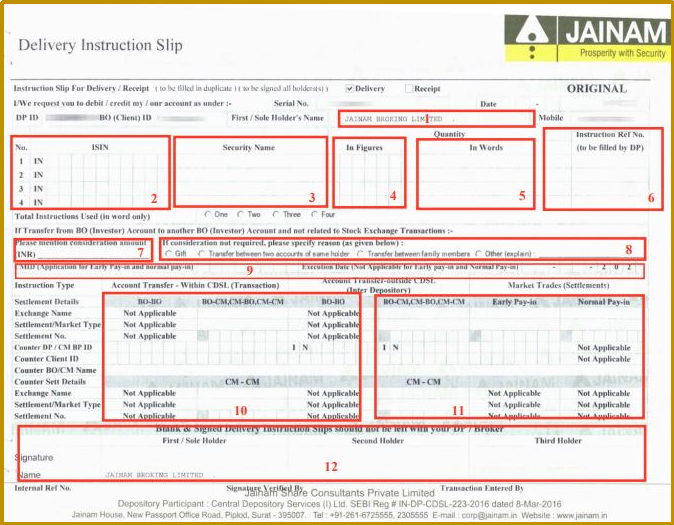 - Signature box: The account holder’s signature must be as per recorded in the Jainam demat account. Add a counter signature if there are any corrections or an overwritten signature.