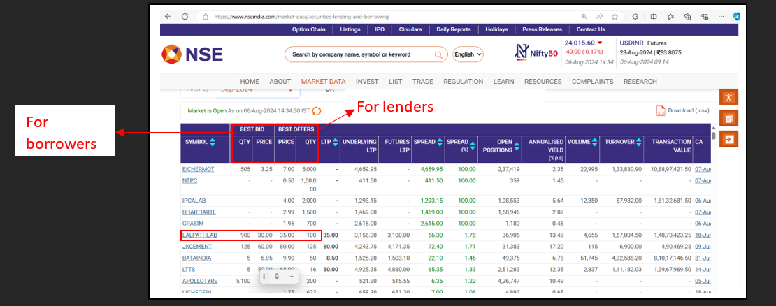 The live lending/borrowing price of eligible securities can be checked by visiting the NSE website (WEB) Best Bid column = for borrowing: - The prices under the Best Bid column show the price at which the shares can be borrowed. |