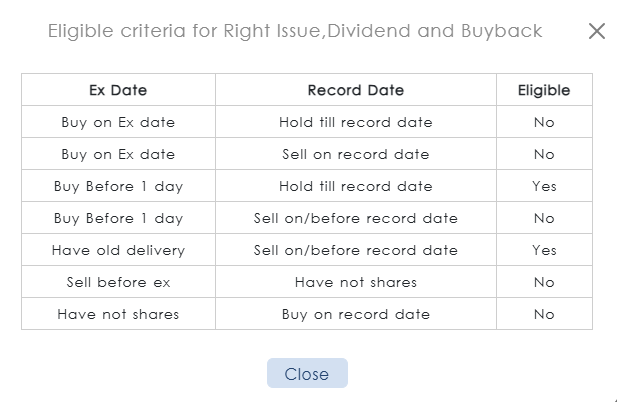 An investor needs to hold the shares in their demat accounts on or before the ex-date or record date to be eligible for corporate action benefits. You can check eligibility criteria for any corporate action by logging into Jplus and selecting corporate actions. |