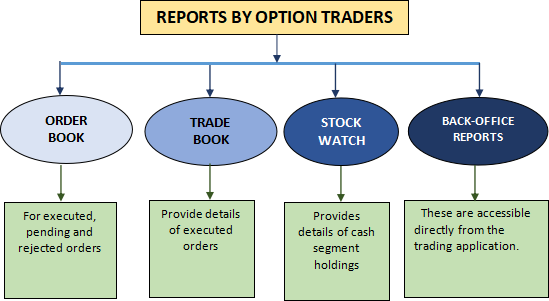 OPTION TRADER provides a number of orders and trade reports:- 1. ORDER BOOKTraders can check the status of all orders in the order book. The order book reflects pending, rejected and executed order status for buy/sell orders for the current trading day. 2. TRADE BOOKAll trades done on a particular day can be viewed in the trade book window. Trade book gives details of the order executed at the exchange along with the execution details such as Traded Quantity and Traded Price. 3. STOCK WATCHIt provides the details of the cash segment delivery based holdings available in the pool account. 4. BACK OFFICE REPORTS In OPTION TRADER, you can access the back office reports directly from the trading application. |