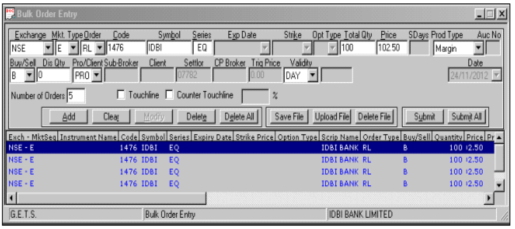 - Bulk Order Entry feature facilitates the user to input multiple orders for offline entry across market segments, across order types, across clients. User add order with Touchline or counter touchline with %. Once he added his orders, he can directly submit the orders to exchange or he can save to file for future submission of orders to exchange. Orders can be loaded from saved file using Load File option.
