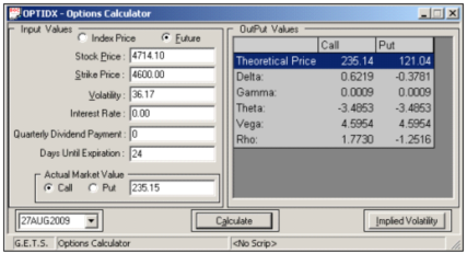 The Option Calculator is useful for obtaining the theoretical option prices for a selected scrip from the Market Watch. Users can get the theoretical option prices along with the option Greeks and volatility standings. It also allows users to access the historical volatility based on the actual market price input for call or put options.