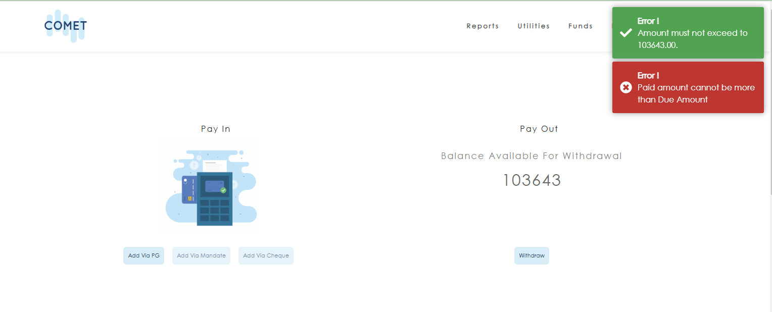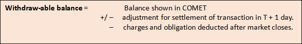 For example, if a client has a credit balance of ₹1,00,000 and has placed a buy order for 60,000 and also placed a payout request for ₹ 50,000. In such a case, the payout will be given only for ₹ 40,000 by the end of the day because the clear/withdrawal balance available will now be ₹ 40,000 only (1,00,000 - 60,000).